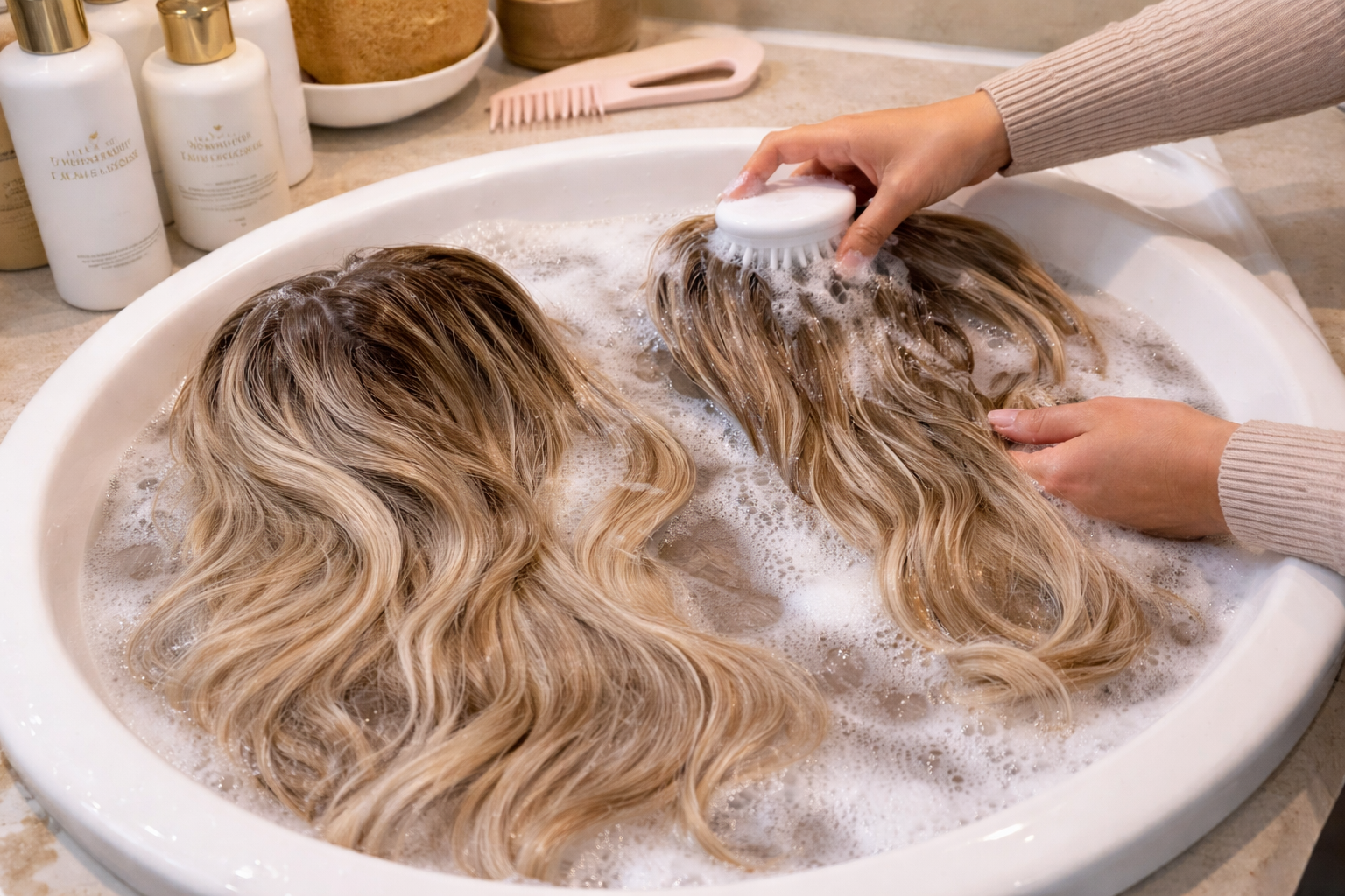 The best way to clean your wig is to use a sulfate-free shampoo designed for wigs. Gently wash in cool to lukewarm water, avoid rubbing or twisting the hair, and always condition the ends to prevent dryness and tangling. Rinse thoroughly and air dry on a wig stand to maintain softness and shape.